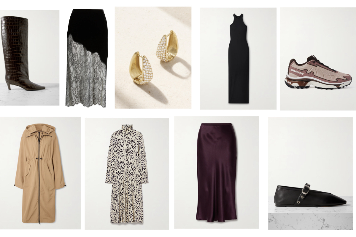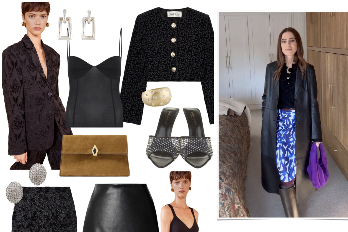 Ulla Jacket. Silver Tiffany Earrings. Velvet Jacket. Silk Camisole. Diamond Dome Ring. Suede Clutch. Saint Laurent Heels. Crystal Earrings. Textured Skirt. Leather Mini Skirt (more sizes here and here). Ulla Dress. Khaite Clutch. Alaïa Clutch. Rhinestone Flats.