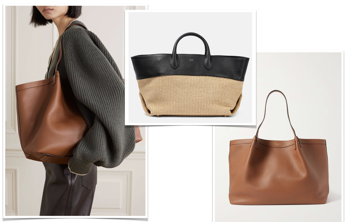 This is the tote bag I’ve carried for the past few years. It’s very simple in design / but the leather is that soft buttery leather that makes the bag… you definitely get what you pay for with The Row. I’ve carried it like I said for years and it still looks brand new. And this medium size version in green has been my crush this spring! The perfect everyday carry-all. Another gorgeous, mega splurge work tote from The Row.