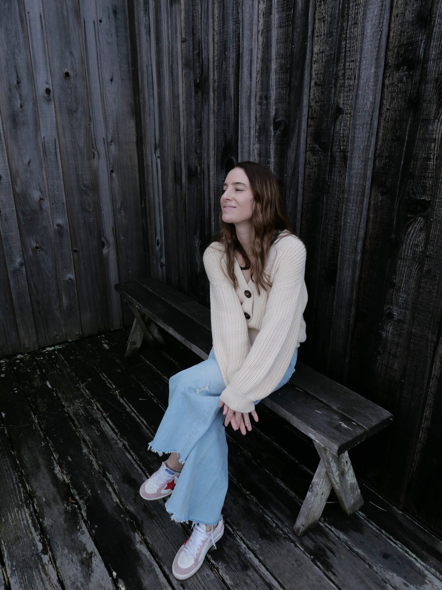 I also just got this style from B Sides which isn’t quite as wide as the Tessa (I took my true size)… but it’s another cool / fresh feeling pair. They also come in this non-blue jean color. I like the fit to be looser than seen here on the model. Both pairs fill the gap in the denim hole if you’re looking for something of-the-moment / interesting in style… more of a baggy boyfriend fit. I would get this pair if you already have a classic denim style and are looking for something fresh and comfy.