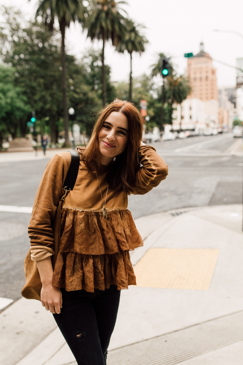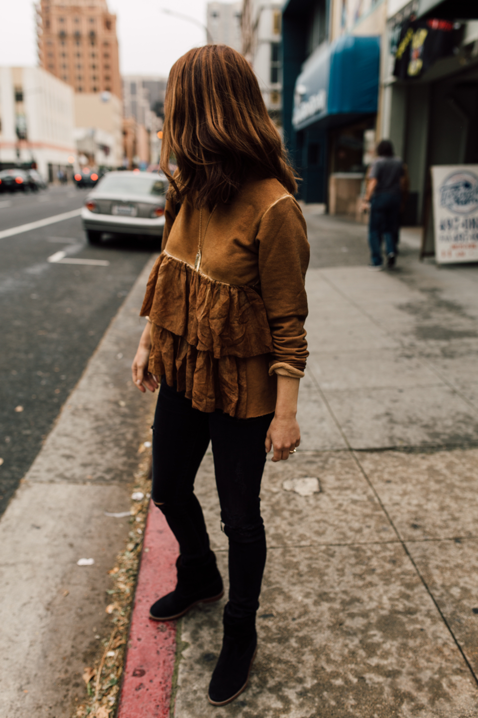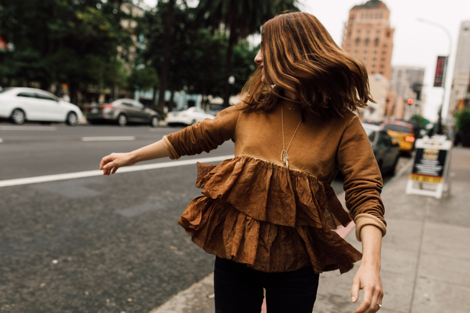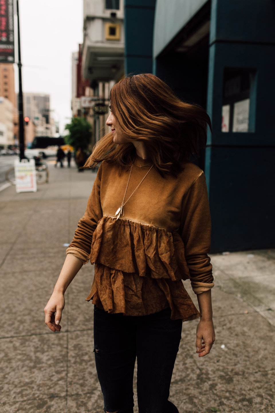 A ruffled sweatshirt? Just the mere thought of it sounds all wrong, but when I first spotted this style by Q House of Basics (remember when I declared my love for this line here) I had to have it. To twirl. To fulfill my girlie side… you know! Since I live in sweatshirts and tees more days than I like to actually admit–the life of a new mom–having a more sweatshirt stylish option is making me feel like I’m sorta dressing up for the day. Even if I may only leave my house for my morning walk.