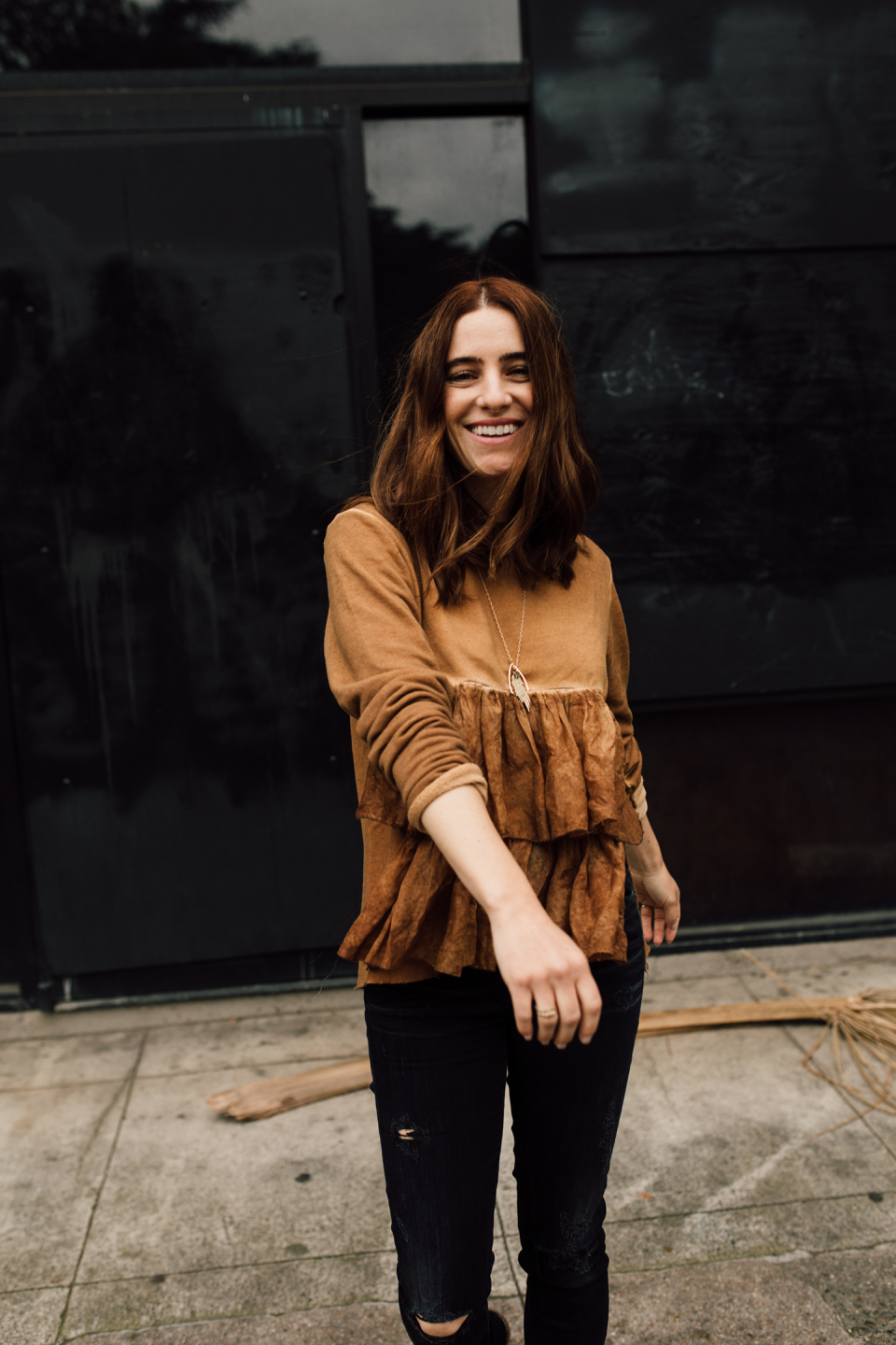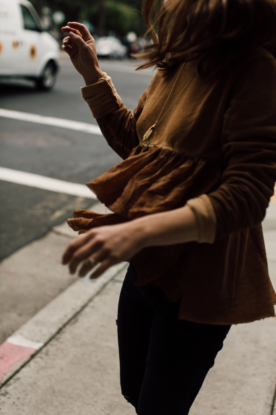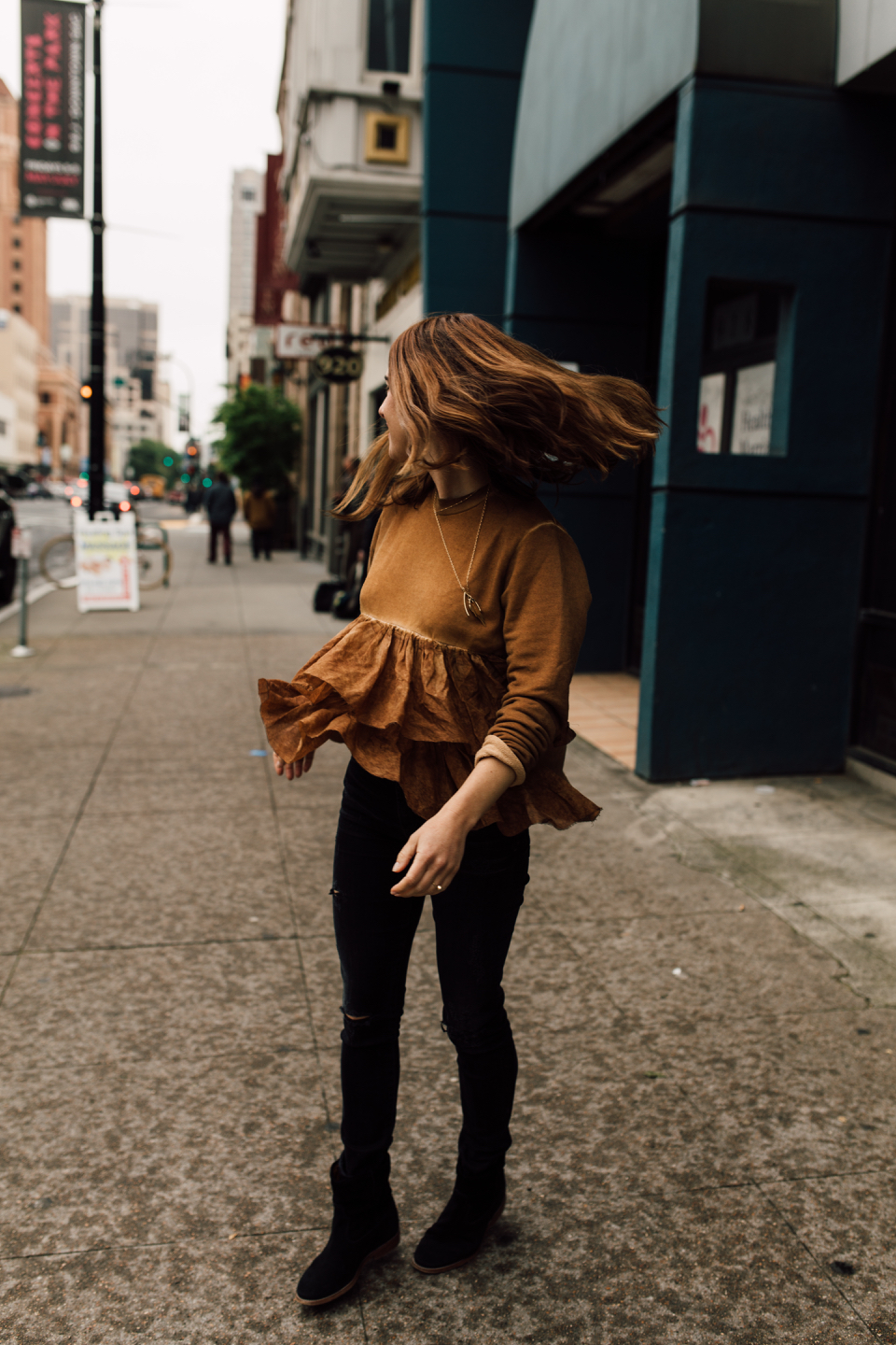 A ruffled sweatshirt? Just the mere thought of it sounds all wrong, but when I first spotted this style by Q House of Basics (remember when I declared my love for this line here) I had to have it. To twirl. To fulfill my girlie side… you know! Since I live in sweatshirts and tees more days than I like to actually admit–the life of a new mom–having a more sweatshirt stylish option is making me feel like I’m sorta dressing up for the day. Even if I may only leave my house for my morning walk.