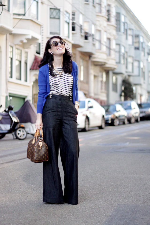JCrew Blouse. Rebecca Taylor Sweater. AG Jeans. Louis Vuitton Purse. Karen Walker Sunglasses.