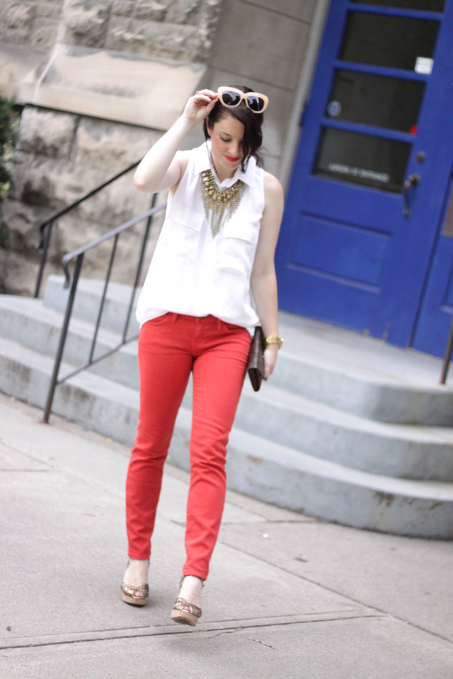 Current Elliot Jeans. Equipment Blouse. Prada Sandals. Vintage and gifted Stella and Dot Necklace.