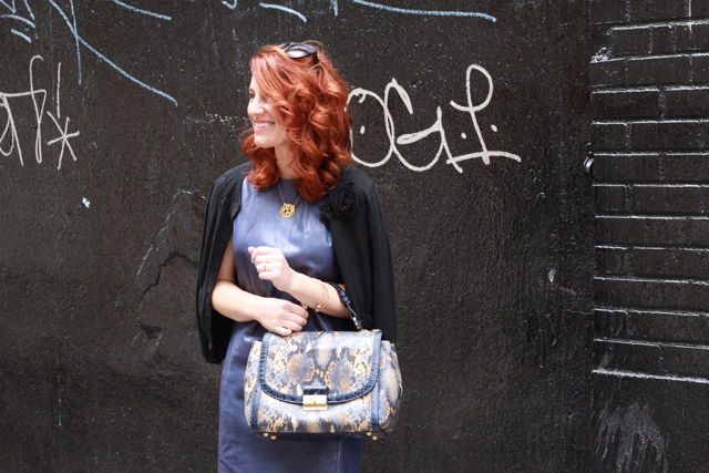 Vince Dress.  Nanette Lepore Sweater.  borrowed Brahmin Bag.  Poshlocket Bracelets.