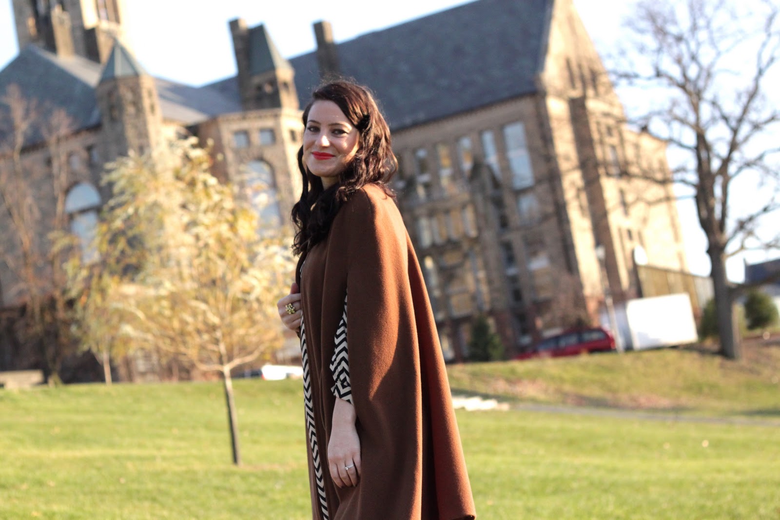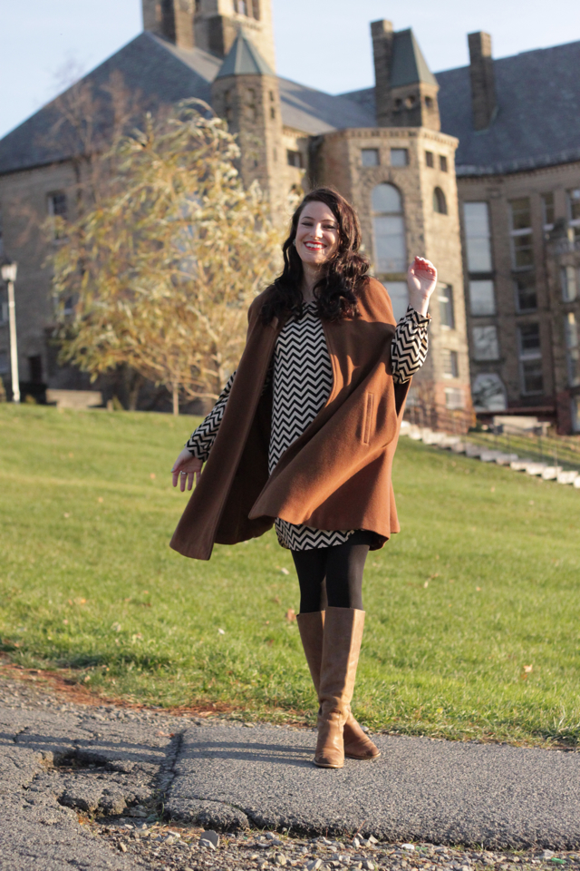 gifted Everly Dress.  gifted Wish Cape (also love this cape).  JCrew Boots (similar) and Earrings.