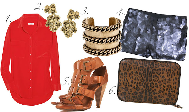 Anything in the color orange / tangerine. Gold accessories. Sequin shorts + office appropriate strappy sandals. Lastly, a new laptop case, preferably in cheetah print. 1. Equipment Silk Blouse2. YSL Lucky Clover Earrings 3. JCrew Chain-Link Cuff 4. JCrew Zoe Paillette-Embellished Shorts 5. Topshop Strappy Buckle Sandal 6. Topshop Leopard Laptop Case Featured: Boticca Join the conversation {The Ultimate} Glitter Girl: Taylor