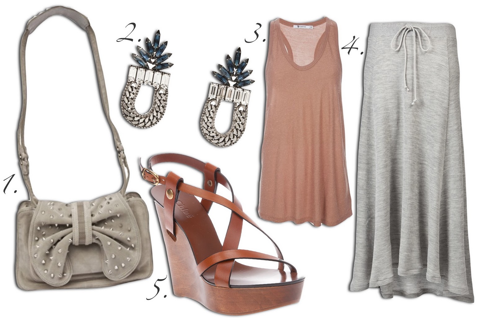1. 3.1 Phillip Lim Edie Bow Bag 2. Dannijo Earrings 3. T by Alexander Wang 4. Elizabeth and James Skirt 5. Chloe Wedge