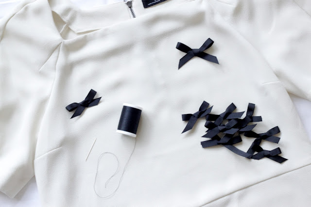 Start sewing the bows on the blouse (no rhyme or reason necessary) and don’t forget the sleeves and back!