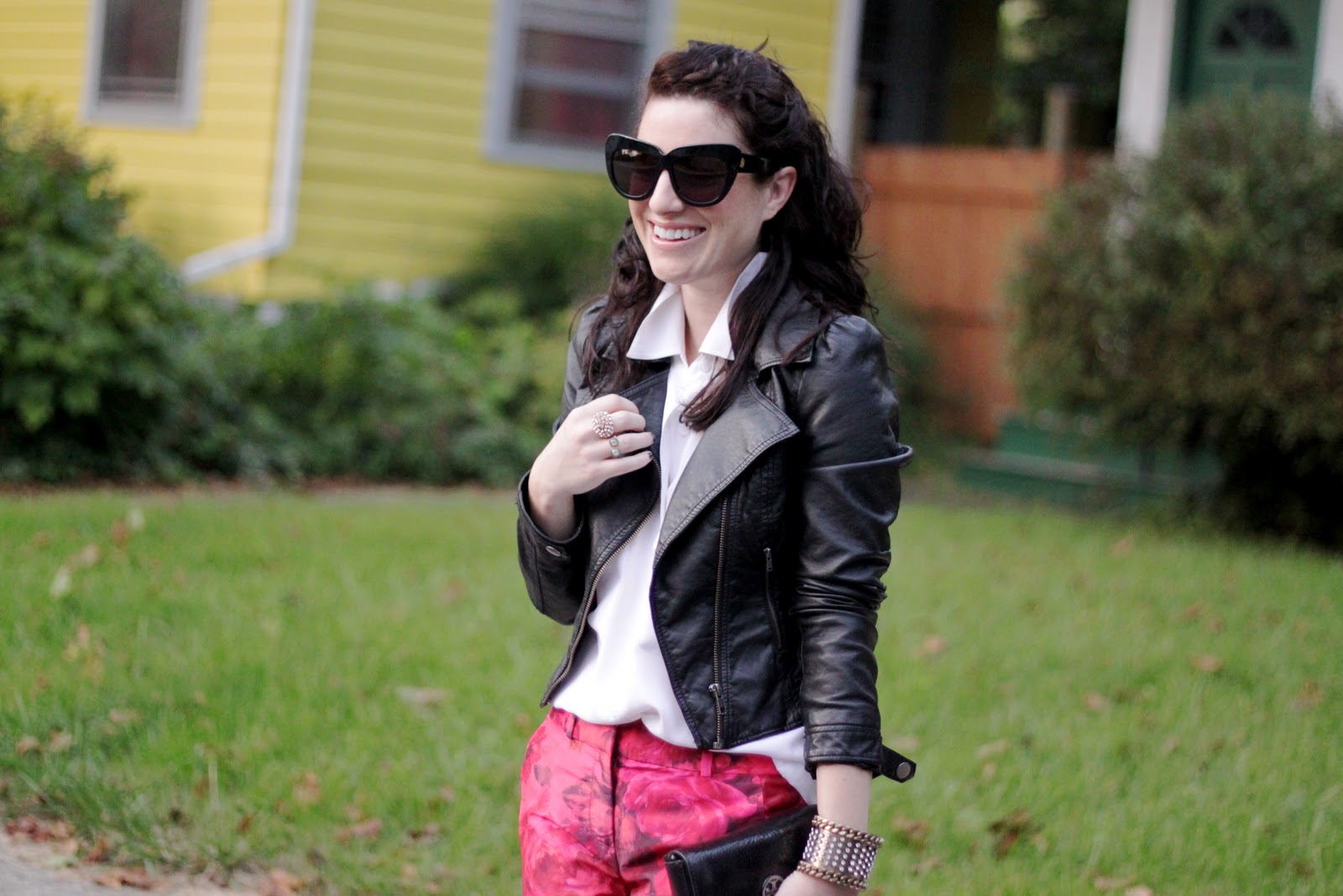 Living in an apartment building primarily filled with college students walking around in sweats 3/4’s of the time has definitely rubbed off on me. I actually found myself walking out our door yesterday with furry slippers still on my feet (no joke). Needless to say, I was in a rut and needed to step up my game; taffeta floral pants were the answer. I toughened up these rather girly “fancy pants” with leather and my favorite rhinestone cuff.