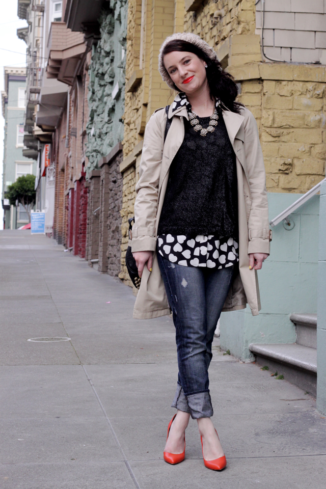 Equipment Blouse. Vince Sweater. Banana Republic Trench. Rock and Republic Jeans. Zara Heels.
