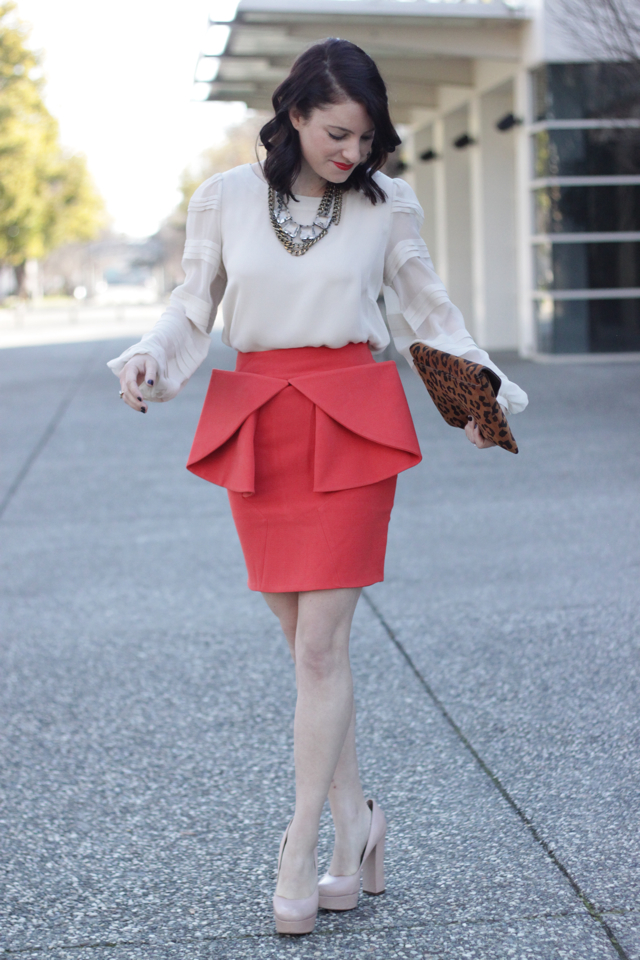 Erin Fetherston Blouse. ASOS Skirt. J.Crew Necklace and Clutch (similar tote style). Steve Madden Pumps.