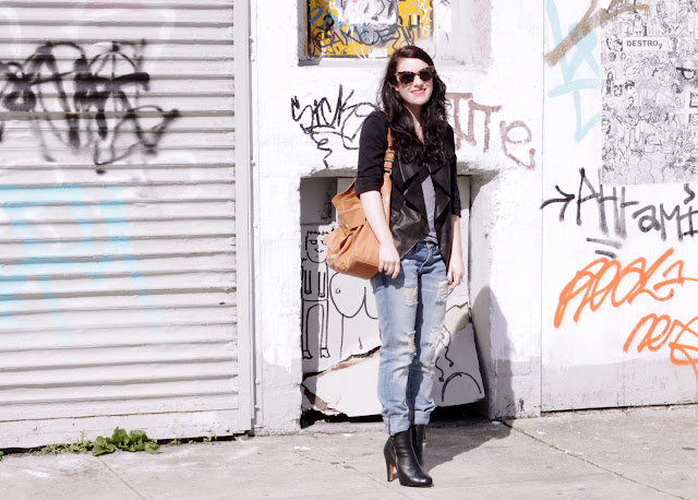 Alice + Olivia Jacket, Current Elliot Jeans, H&M Tee, Vintage Boots, Tory Burch Bag, Norma Kamali Sunglasses