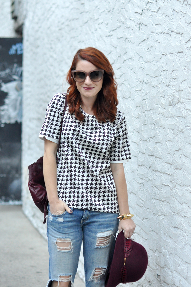 I’m completely smitten with this top! The hound’s tooth print, boxier cut and longer sleeves is right up my alley. Luckily it was warm(ish) on the day I sported this look so I was able to go sans jacket / sweater.