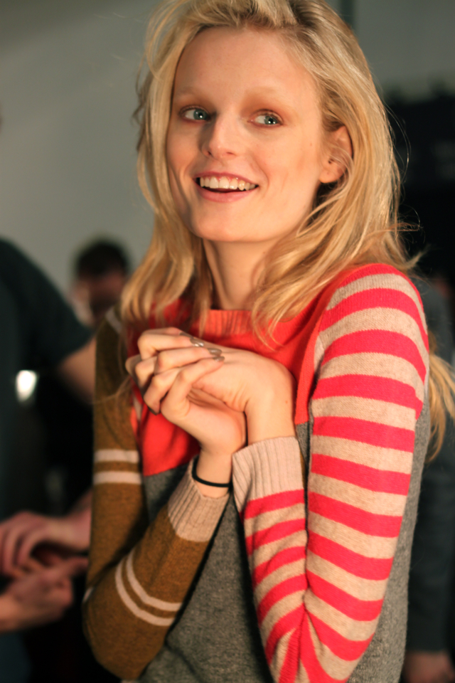 Very natural almost masculine looking makeup and grey nails backstage Richard Chia.
