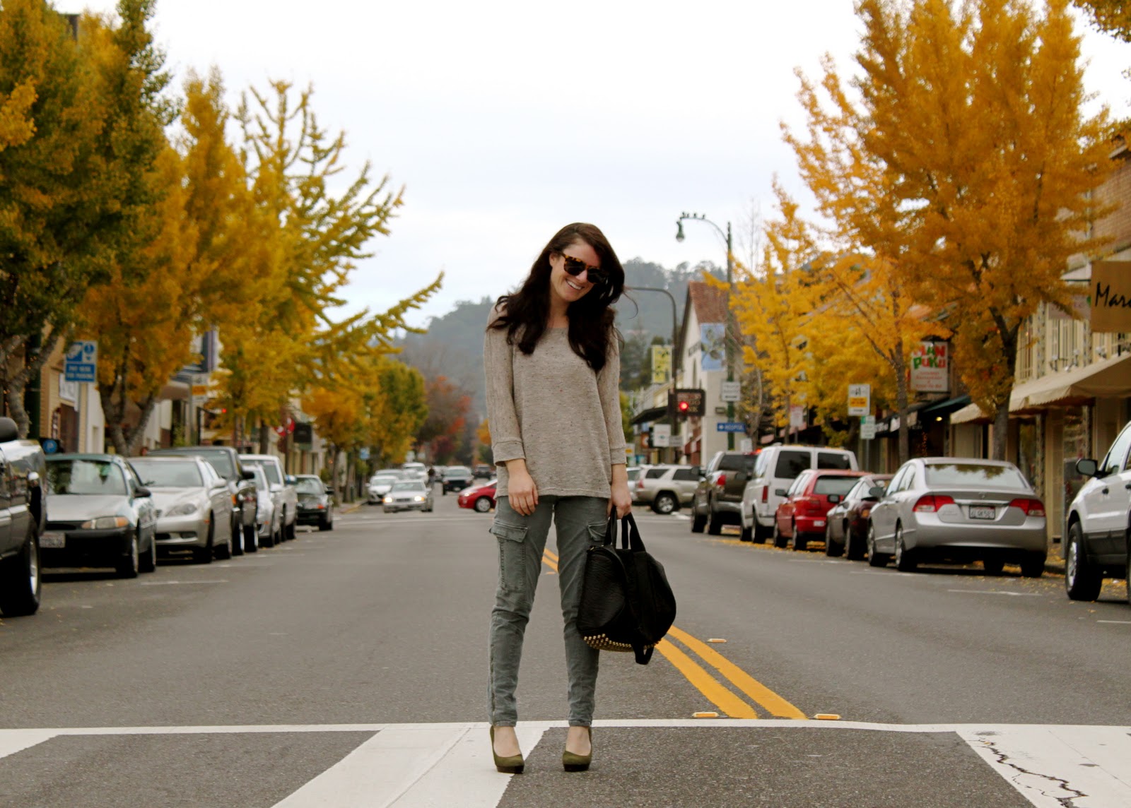 JBrand Cargos, Forever 21 Sweater, Banana Republic Pumps, Alexander Wang Bag, Karen Walker Sunglasses